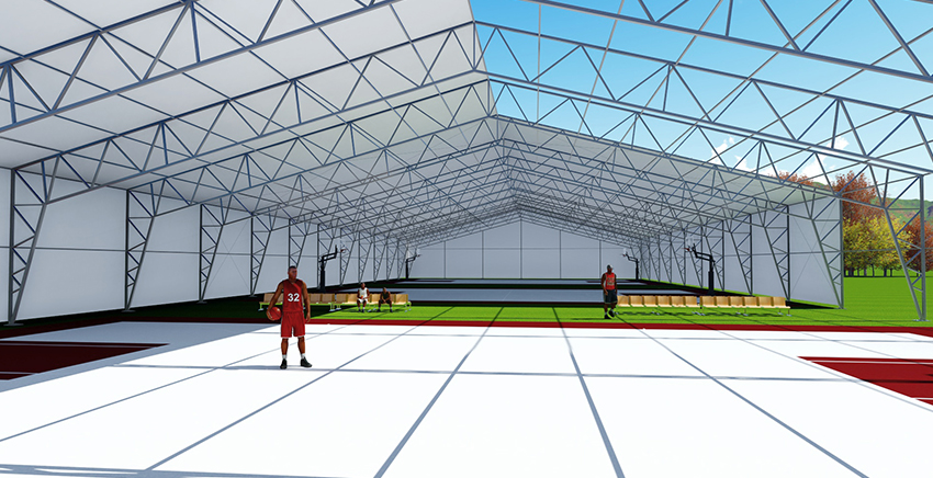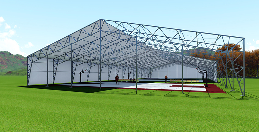鋼框架篷房的主體結(jié)構(gòu)采用高強(qiáng)度鋼管材料,屋面采用鋼纜斜拉條加固,屋面及墻面均有基布圍護(hù)。鋼框架篷房工所用材料及結(jié)構(gòu)具備很高的完整性與安全性。