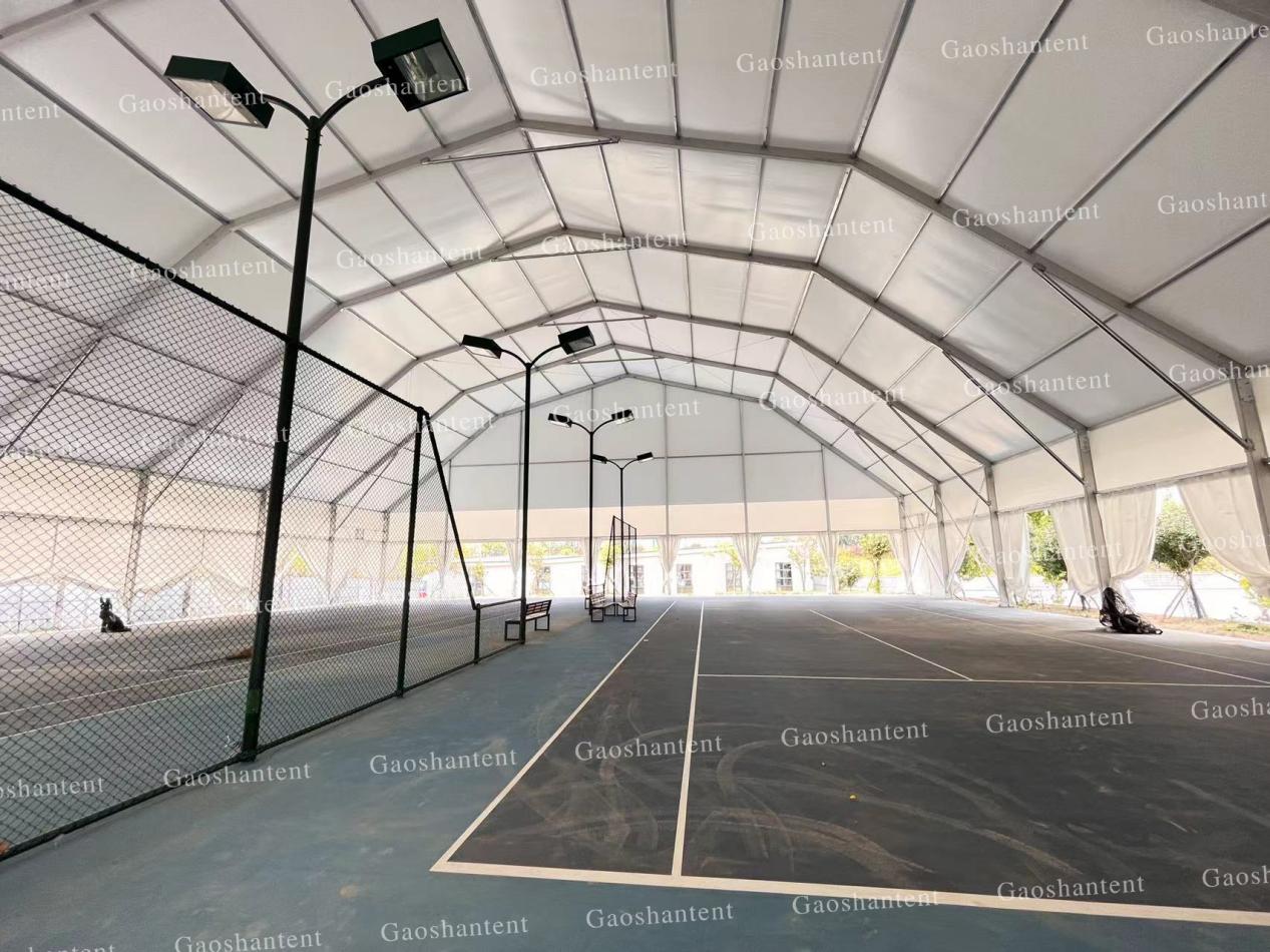 多拱型篷房除了造型新奇外,與人字篷房相比,其頂高能做到更高,內(nèi)部空間擴(kuò)大,更適用于網(wǎng)球等球類運(yùn)動(dòng)場(chǎng)景。網(wǎng)球館四周篷布可以拉開通風(fēng)也可以無縫圍起遮風(fēng)擋雨。
