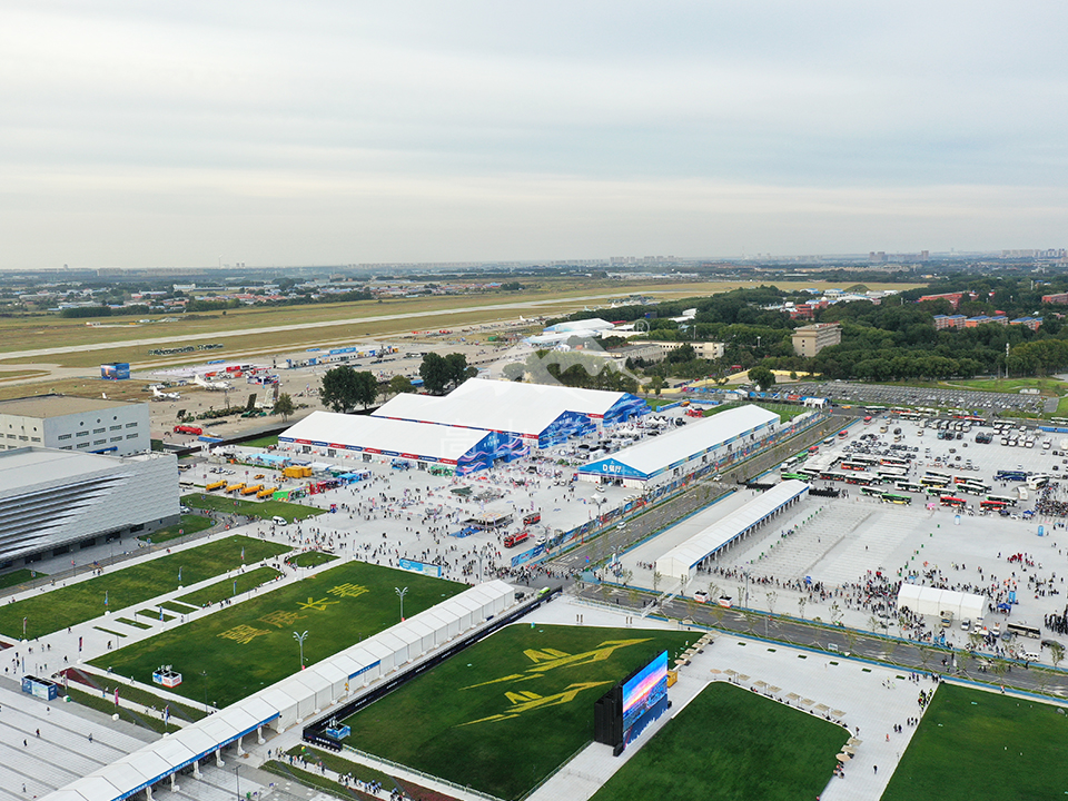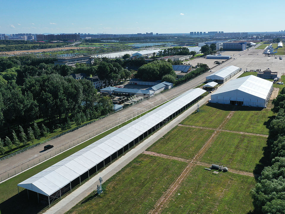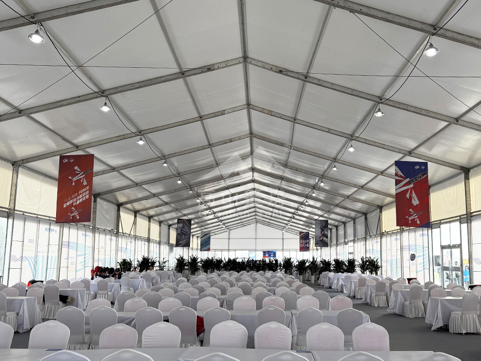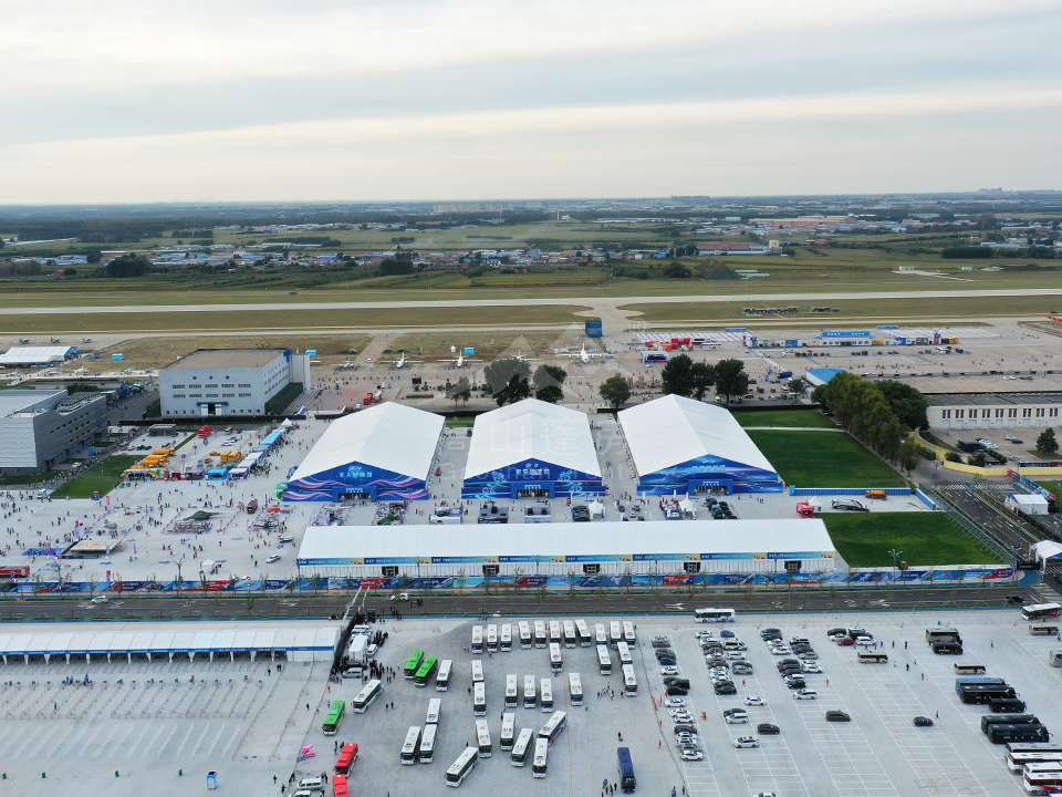 高山篷房憑借高強(qiáng)度鋁合金型材和阻燃雙面PVC篷布,為航展提供抗風(fēng)、防水、防火、防紫外線的優(yōu)良性能。