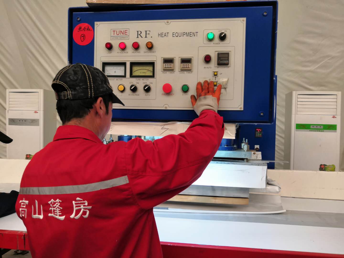 走近一看,確實(shí)是他倆,原來他們?cè)谔接懪癫嫉馁N合程度問題,山總強(qiáng)調(diào),在熱熔時(shí)一定要注意溫度的把控,只有合適的溫度才能完美的熔合出優(yōu)質(zhì)篷布來。