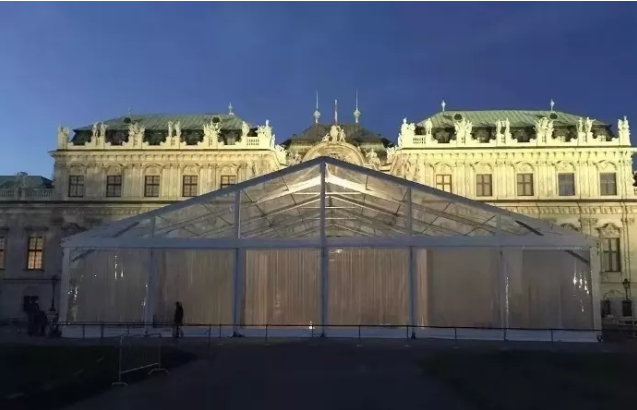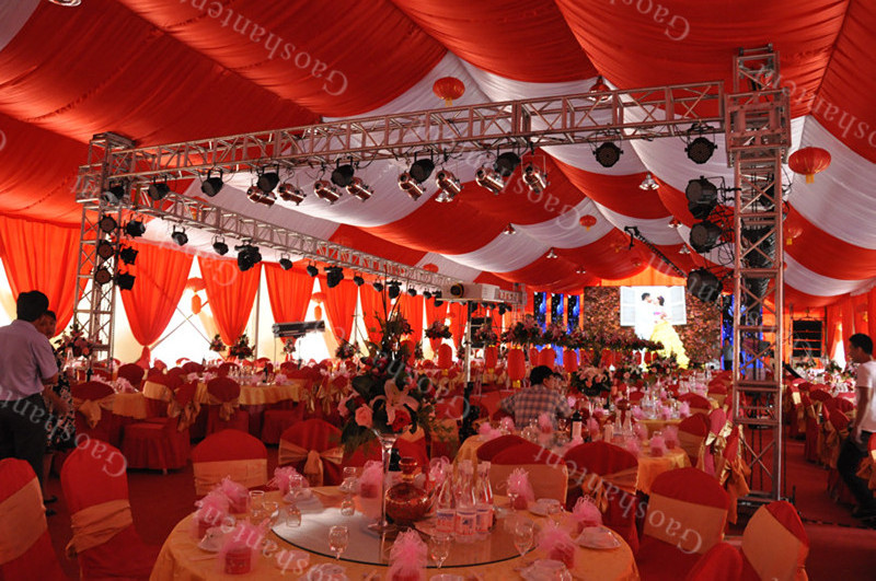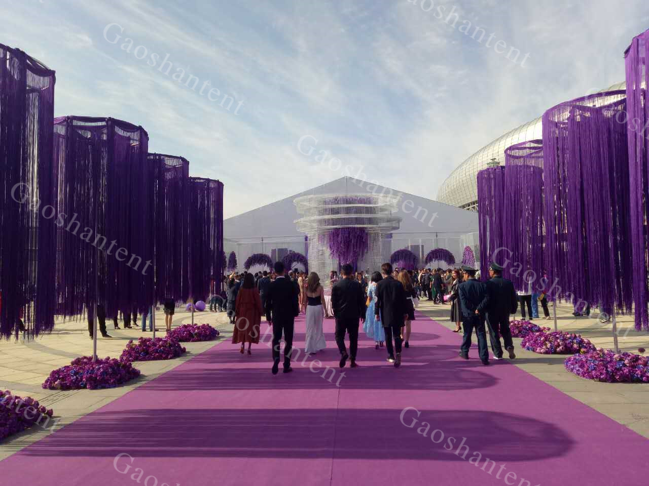 高山篷房還可量身定制進(jìn)行篷房的布置和提供配套服務(wù)。篷房內(nèi)的空調(diào)、地板、燈光等為基本配置,高山還能用布幔、擺設(shè)等將其布置成五星級酒店大廳,并提供舞美、表演、樂隊等配套服務(wù)。